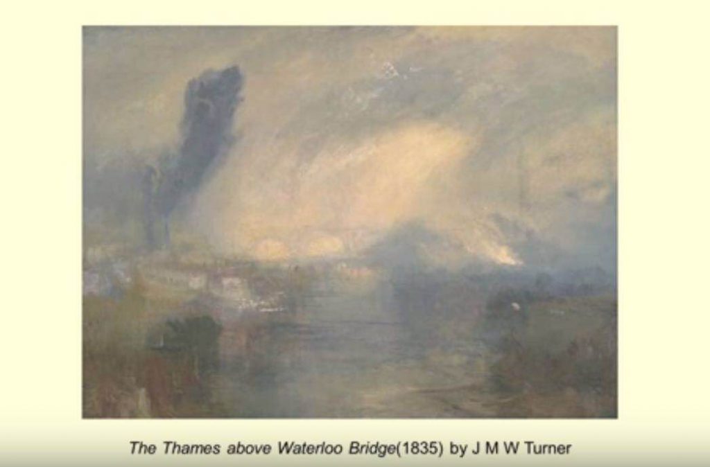 • Turner painted one of the earliest pictures of London’s fog in the 1835. Turner is familiar with London’s air problem by putting smoke at its center. The bridge is the central elements, and it is a theme that’s later taken up by Monet. We see a shot-tower and a steamship. They were very smoky and barely visible. The speaker thinks they represent for a flourishing economy, but also the dirt and pollution.